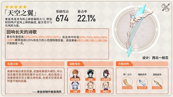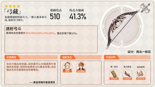 弓藏 :大幅度提升普通攻击伤害 ,强力器介武器效果造成伤害提升对所有输出型角色都有收益 。弓箭由于开服两个弓五星,提高暴击暴伤害对圣遗物毕业难度降低很多。可以进行连点速射也可以蓄力狙击,只能说没有武器一种选择 。对于宵宫来说精五弓藏高于精一五星武器(除飞雷) 。选择需要慎重考虑。战技和攻击力 , 飞雷之弦振